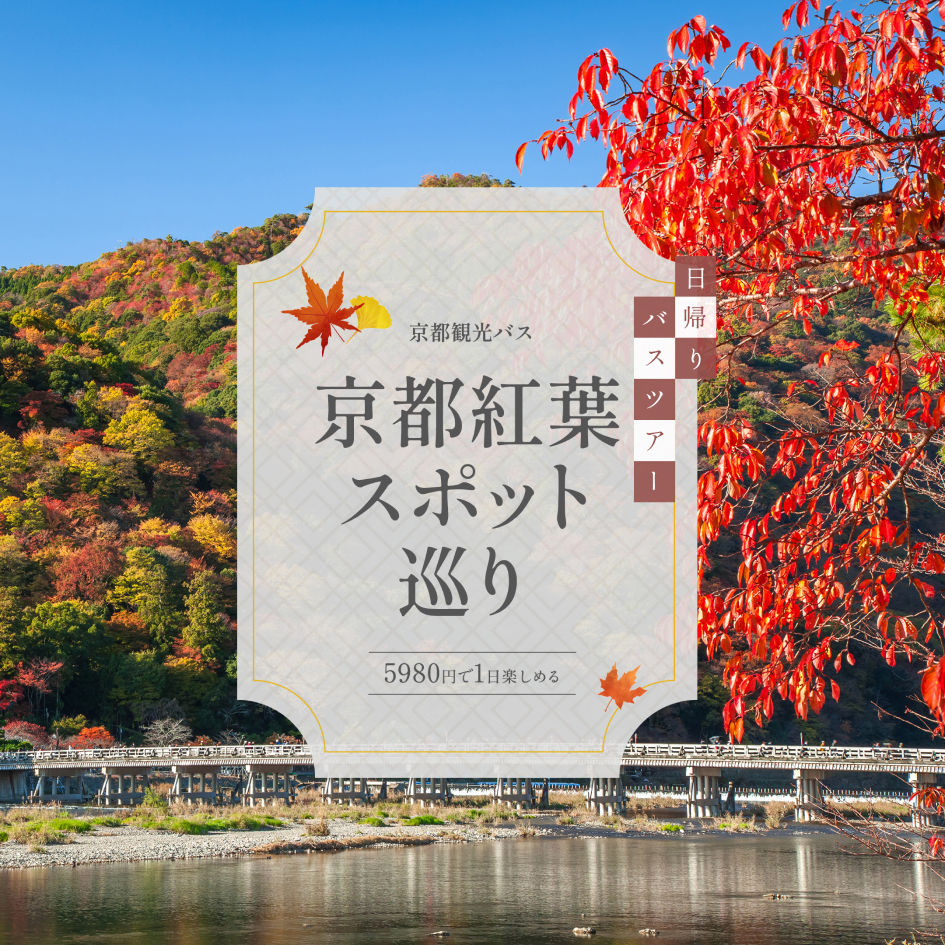 - 京都の紅葉を巡るバスツアーの参加を促すバナーなので、金額の表記よりも「京都紅葉スポット巡り」を一番大きく中央に配置しその横に「日帰りバスツアー」の文字を縦書きで配置することで一目見て京都のバスツアーのバナーだとわかるようにしました。