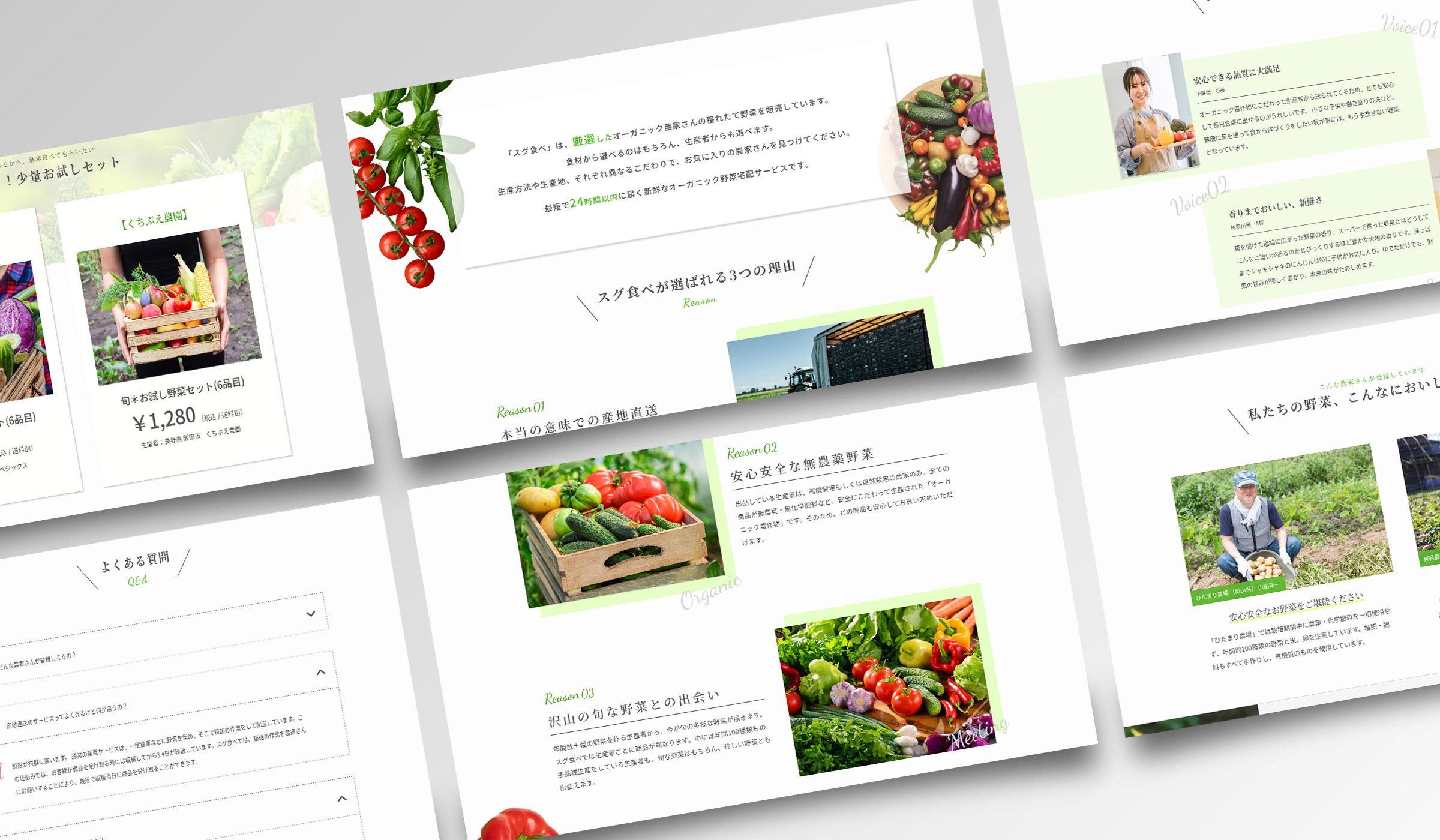 - ナチュラルで清潔感のあるデザインにするためにベースカラーは白色を使用しました。メインカラーは新鮮な野菜をイメージしてもらうため緑色を使用し、アクセントカラーに赤色を使用しコンバージョンボタンをデザインしました。フォントはゴシック体を使用し読みやすさと親しみやすさを出し、あしらいで筆記体を使用しリッチなイメージを出しました。